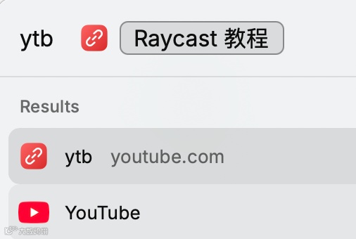 Quicklinks 功能是 Raycast 的一大特色,用户自定义关键词与网址或搜索内容的关联后,几个字母就能直达目标。设定 “gg” 代表在 Google 上搜索,“ytb” 代表搜索 YouTube ,输入 “gg” 再输入关键词,就能直接显示 Google 搜索结果;设定 “gp” 打开极客公园官网,“edit” 打开文章排版网站,使用起来极其便捷。