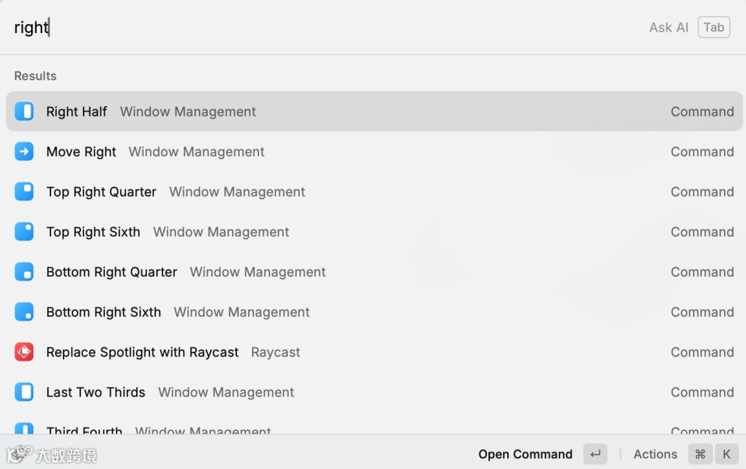对于经常分屏工作的用户,Raycast 的窗口管理功能堪称福音。输入 “Left Half(左半屏)”“Top Right(右上角)”“Maximize(窗口最大化)” 等指令,就能迅速排列任务窗口,比传统鼠标拖动操作更精准高效。