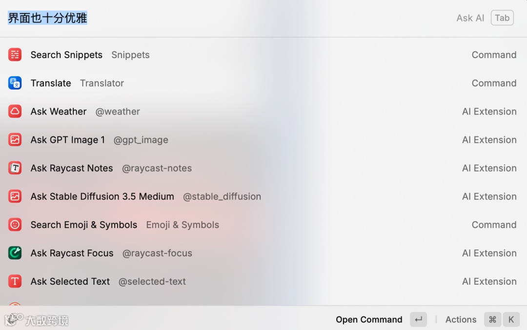 在 WWDC25 上,苹果对 Spotlight 进行了重大更新,增加了自然语言搜索、图片识别能力,并支持更强的 Siri 集成,但与 Raycast 相比仍有诸多局限。Spotlight 本质是 “闭源搜索工具”,功能由苹果自上而下定义,用户缺乏灵活性和自主性;而 Raycast 提供高度自定义空间,能满足不同用户多样化需求。