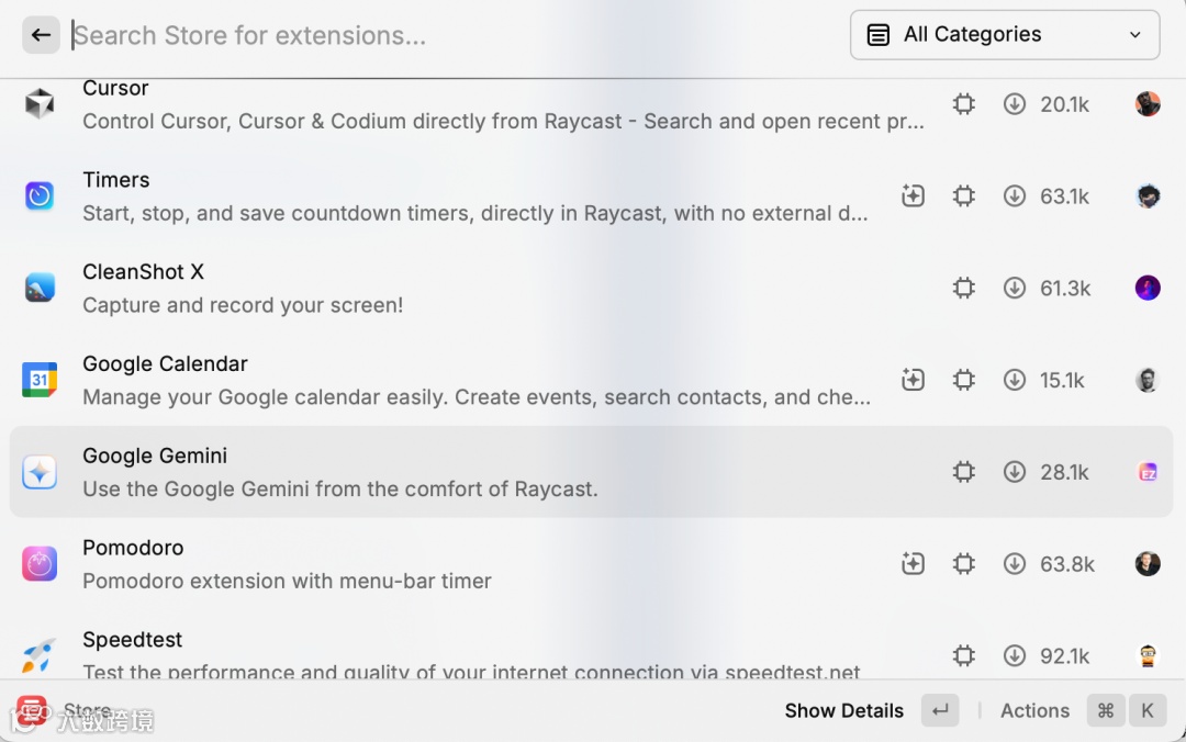 在 Raycast 中输入 “Store”,会打开由社区驱动的扩展商店,这里汇聚了众多开发者为各种主流应用和服务开发的定制插件,覆盖从开发工具到日常应用的各种场景。安装 Zoom 扩展可直接启动 Zoom 会议,Google Translate 扩展能快速翻译文本,安装 video downloader 插件可下载视频。在这些插件加持下,用户在 Raycast 界面就能实现查询 Notion 数据库、发布 Tweet、控制智能家居、查询股票和加密货币行情、搜索 Giphy 动图、测试网速等丰富功能,使 Raycast 从系统启动器变成了 “超级入口”。