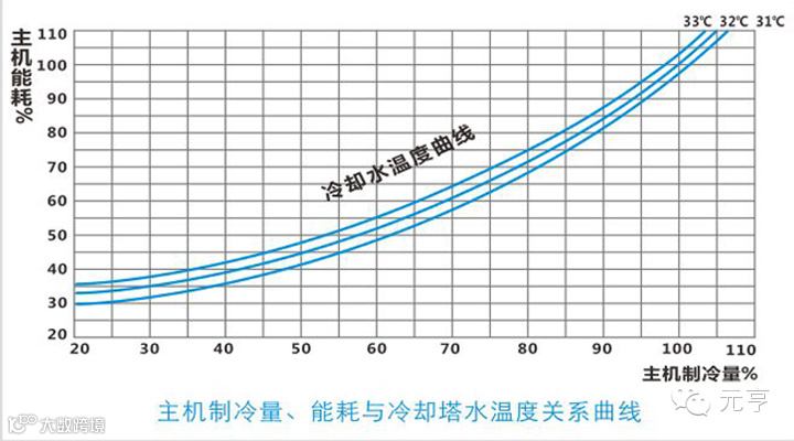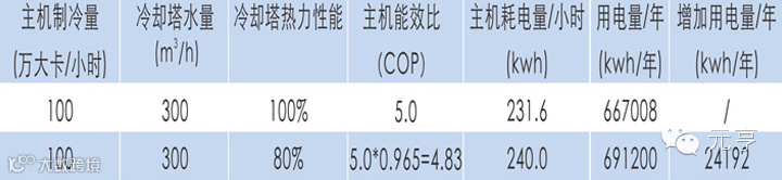 元亨冷却塔热力性能为100%,表示在标准工况下,冷却水温差可达到5℃(37℃~32℃)。当某品牌冷却塔热力性能只能达到80%时,冷却水回水温度比额定工况高了1℃,要使主机制冷量达到100%,主机能耗将增加3.5%。