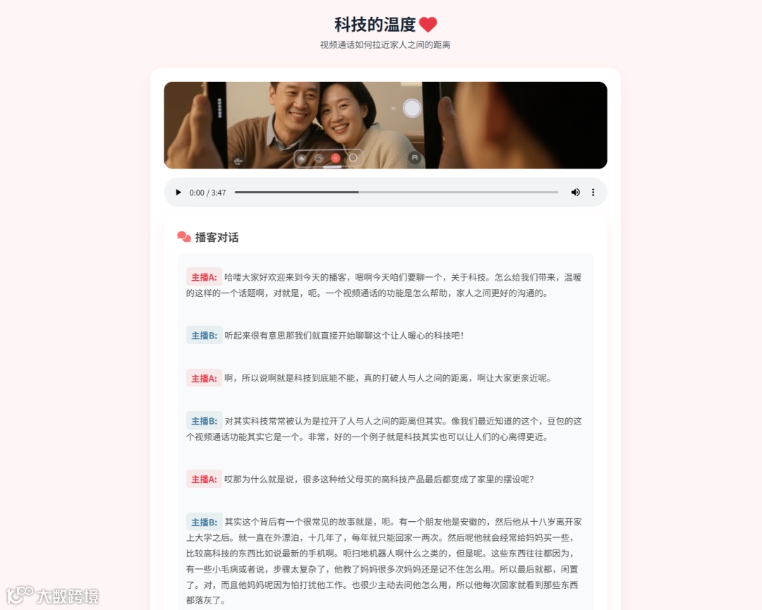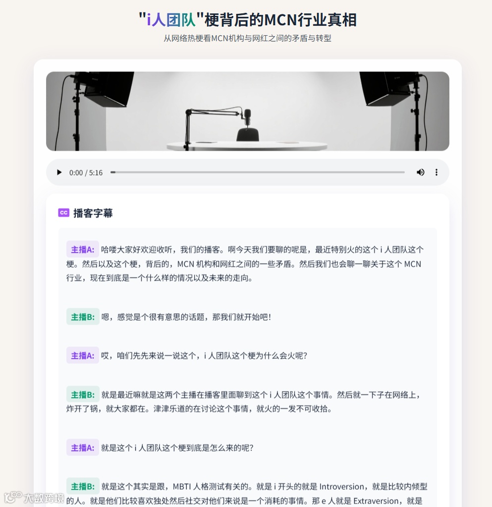 跨媒介融合上,扣子空间创造的"可视化播客网页",模糊了音频与图文的边界。在生成的网页中,用户可以边听边看逐句字幕,点击关键词还能弹出背景知识卡片——这种"听觉为主、视觉为辅"的呈现方式,既解决了纯音频容易走神的问题,又避免了视频的视觉压迫感。我曾将一篇关于"数字生命伦理"的深度文章转化为这类网页,用户反馈"像在参加一场隐形的读书会,既有听觉陪伴又能随时回顾要点"。这种创新让播客从"单一媒介"升级为"复合信息载体",极大拓展了内容的传播维度。