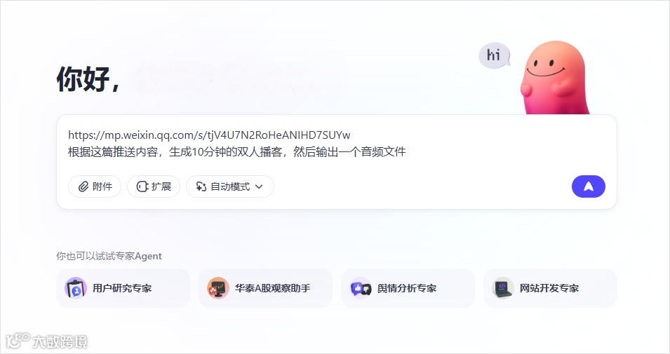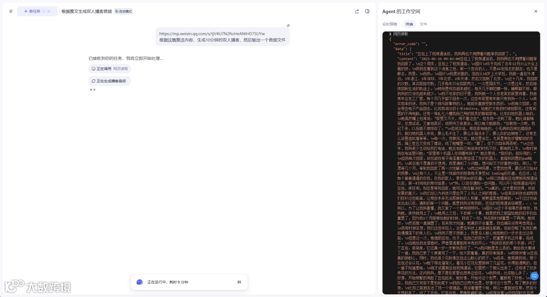 扣子空间将AI播客的生成流程压缩到"一句话指令"的极简程度。用户只需在平台输入:"根据公众号文章《____》生成10分钟双人播客",系统便会自动完成从文本抓取、内容解构、对话生成到语音合成的全流程。我曾用一篇2000字的科技评论进行测试,从提交链接到获得成品仅耗时8分钟——而传统人工制作同质量播客,仅脚本改编和配音就需要2-3小时。