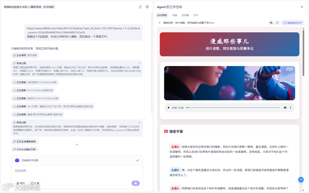 这种效率革命源于扣子空间独特的技术架构。其核心是集成了网页读取MCP插件和豆包大模型的智能工作流:前者能解析微信、知乎等平台的文章内容,后者则负责将书面语言转化为符合播客语境的口语化对话。在实际操作中,系统会自动识别文本中的核心论点,生成类似"主播A提出观点-主播B补充案例-主播A反驳"的对话结构,这种逻辑拆解能力让一篇严肃的技术分析瞬间具备了脱口秀的互动感。更贴心的是,系统会根据内容类型自动匹配主播声线——科技类文章默认使用沉稳男声+知性女声组合,娱乐八卦则切换为轻快的年轻声线,这种个性化适配极大提升了内容的沉浸感。