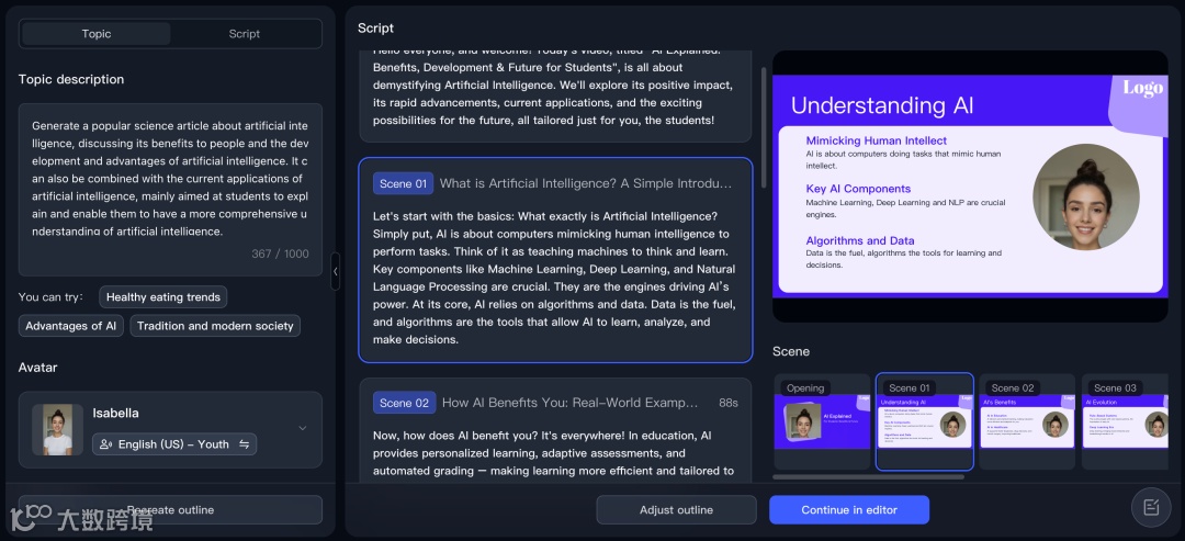 正是洞察到了这一痛点,Keevx 应运而生,以强大的 AI 技术为核心驱动力,致力于打破视频创作的壁垒,让专业级的视频制作变得触手可及。其最令人瞩目的功能之一,便是 AI 一键生成脚本。用户只需输入简单的主题描述,Keevx 便能依托先进的人工智能算法,迅速生成逻辑清晰、内容丰富的脚本文案,并同步规划出详细的视频分镜。这一功能不仅极大地降低了创作门槛,还为创作者提供了全新的思路和灵感。在以往,构思脚本和分镜往往需要耗费大量的时间和精力,而现在,Keevx 能够在短时间内完成这些复杂的工作,让创作者可以将更多的精力放在内容的个性化表达和创意优化上。同时,结合平台内挑选的优质人像和丰富多样的视频模板,用户只需轻点一键,就能实现智能视频创作,轻松产出具有专业水准的视频作品。
