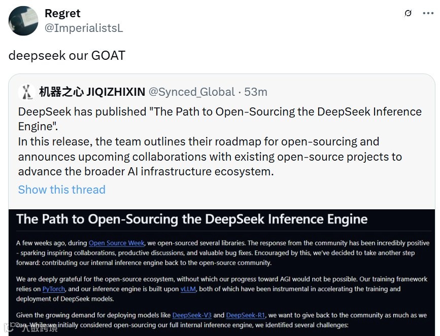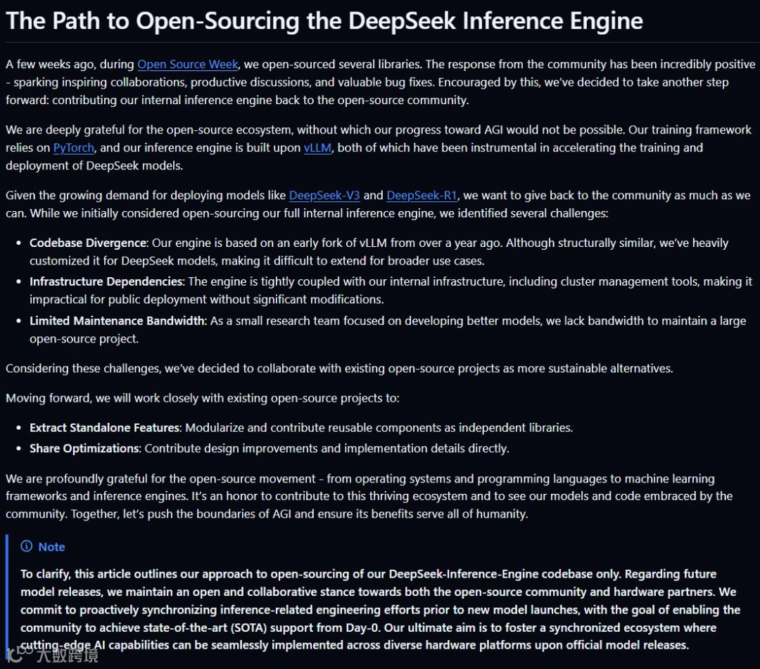 在位于深圳的DeepSeek办公室里,工程师们或许正经历着微妙的情绪变化——从最初在开源周发布多个工具库时的试探,到如今决定将核心推理引擎回馈社区的坚定,这个成立于2023年初的AI公司,正用行动诠释着对开源精神的理解升级。文档页面的两次修改痕迹尤为值得玩味:首版中明确提及的“SGLang”和“vLLM”两大开源项目,在第二版中被替换为“现有的开源项目”,这种措辞调整并非简单的文字游戏,而是彰显了DeepSeek从“特定合作”向“社区共建”的战略转向。