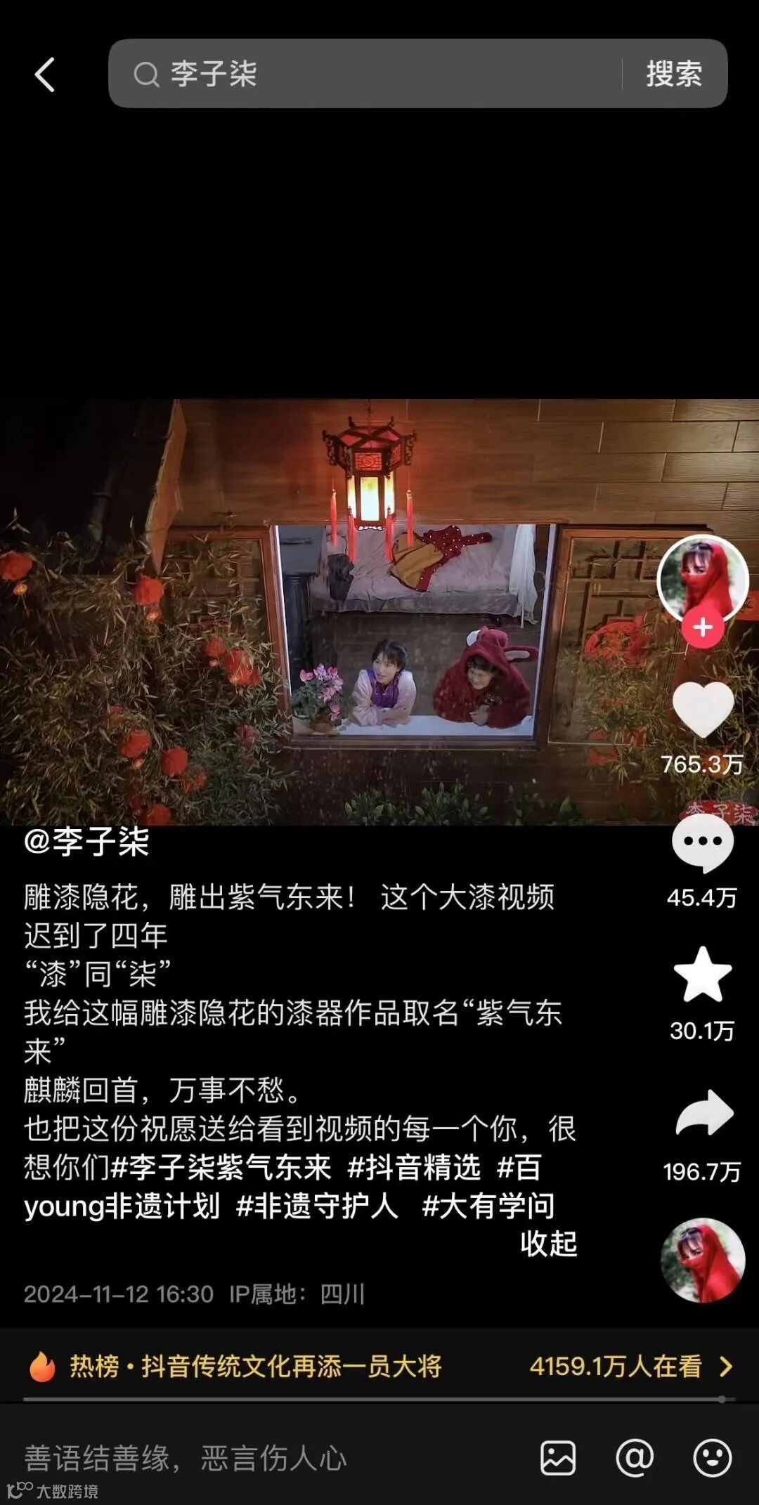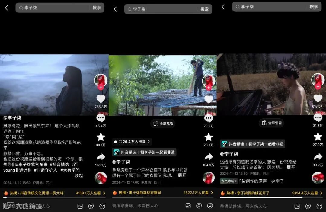过去,李子柒就多次在视频中展示中国非遗项目,如今从其复出迹象看,传承和推广非遗在她今后的内容创作中的占比或许还将大幅度提高。在“退网”的三年多里,她走访了二十多个省份,拜访了一百多名非遗传承人和文化工作者,可见她一直在为传承传统文化默默努力着。她用自己的行动诠释着对传统文化的热爱,通过视频将那些古老而神秘的非遗技艺展现给全世界,让更多人了解中国传统文化的博大精深。