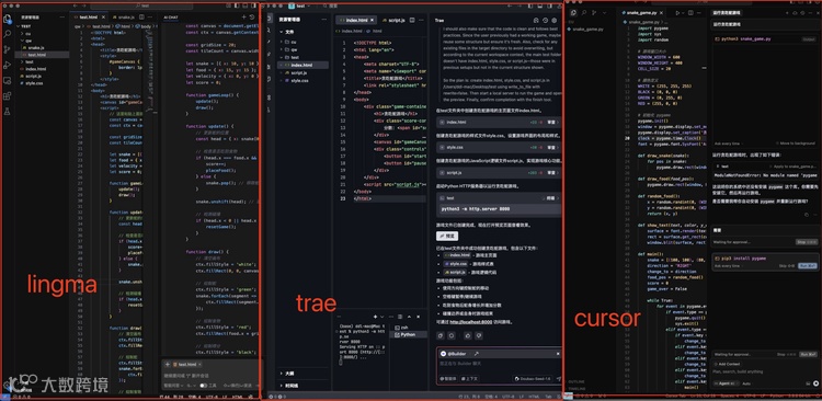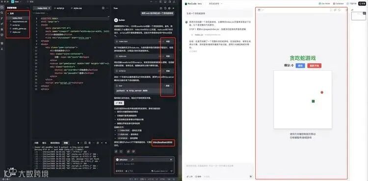 这种定位差异在执行具体任务时表现得更为明显。当要求两者 “生成一个贪吃蛇游戏” 时,Trae 会有条不紊地生成代码。若涉及外部 Python 库,它会主动提醒用户下载。AI 修改代码后,也会提请用户审查,工作流程严谨规范。相比之下,NoCode 更倾向于 “全权负责”:用户输入需求后,只需等待 AI 输出结果即可。后续修改环节也体现了交互逻辑的不同 —— 在 Trae 中需通过右侧的 Chat 栏与 AI 沟通,而在 NoCode 中则使用左侧的对话框。