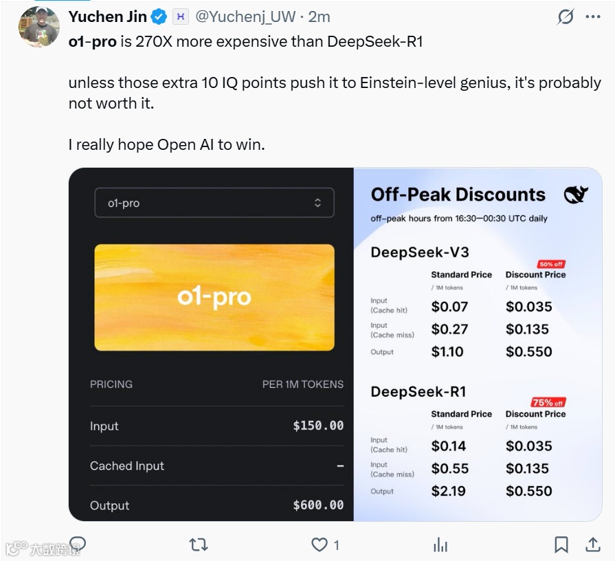 将o1-pro置于市场坐标系中,其价格策略的特殊性愈发明显。与DeepSeek-R1等竞品相比,o1-pro的定价堪称"天文数字"。DeepSeek-R1不仅提供亲民的基础定价,更推出错峰优惠时段,进一步降低使用成本。