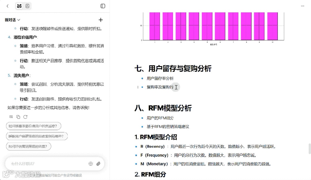办公小浣熊2.0还深度融合了“日日新”融合大模型的原生融合多模态能力,实现了多模态理解和交互。以数据分析为例,在数据清洗和预处理阶段,它能自动处理数据中的各种问题,如补全缺失数据、修正错误等,大大提升了数据处理的速度和准确性。在数据可视化方面,它能自动选择最合适的图表类型,生成清晰美观且可交互的图表,让即使不懂复杂工具的用户也能轻松制作专业图表。