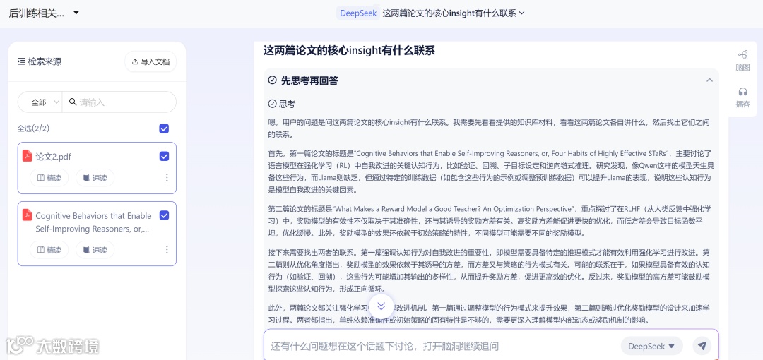 当面对综合性研究问题时,跨文献问答功能展现出强大的整合能力:用户可选中多个文献或整个知识文件夹作为对话上下文,系统基于DeepSeek的长文本理解能力,综合多源信息生成结构化回答,并精准标注每一个观点的文献来源,实现了RAG技术在科研场景中的深度落地。这种将分散知识转化为关联网络的能力,不仅提升了信息复用效率,更让跨研究方向的灵感碰撞成为可能。