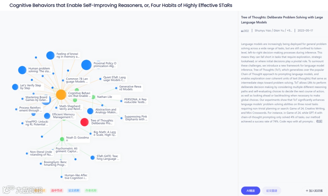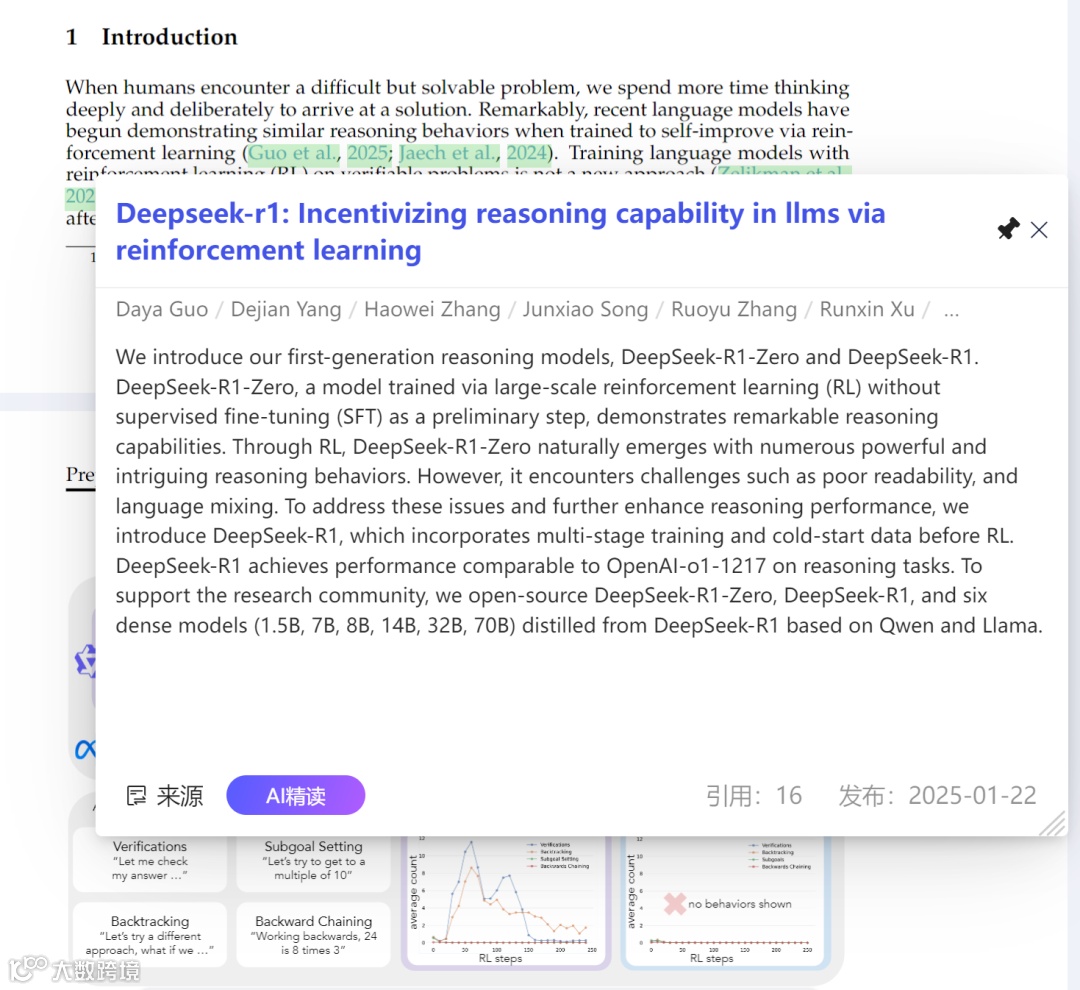 引文网络探索功能则构建了文献阅读的「无限延伸」场景——点击文中引用标注即可直达被引文献并开启精读模式,配合独特的「论文图谱」功能,所有相关文献及作者研究脉络以可视化网络呈现,帮助研究者快速定位领域核心成果与发展脉络。搜索模块的「专业模式」与「深度搜索」选项则精准匹配科研场景的严谨性需求:前者优先检索权威学术资源,后者通过多轮推理验证答案准确性,避免了通用模型常见的「幻觉」问题,确保每一次知识获取都经得起学术验证。