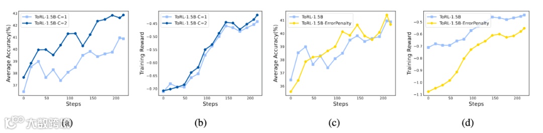 为了平衡训练效率与探索能力,ToRL引入了多项关键设计。超参数C控制每次响应允许的最大工具调用次数,在性能与效率间找到最佳平衡点;稳定的代码解释器和沙盒环境确保执行结果的可靠性;基于规则的奖励函数仅以答案正确性为导向,避免惩罚机制可能导致的保守策略。这些设计共同构建了一个开放而可控的学习环境,让模型能够在安全边界内充分探索工具使用的无限可能。