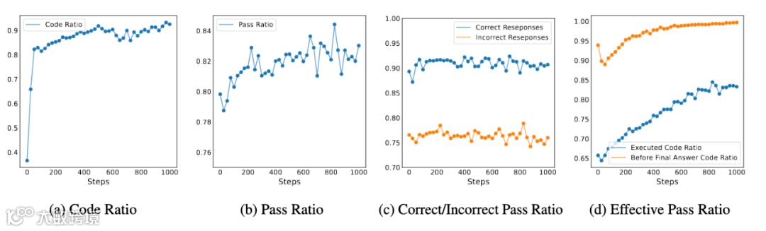 在数学推理任务的验证中,ToRL展现出令人瞩目的性能优势。其7B模型在AIME24基准上的准确率达到43.3%,远超基线模型14%的提升。更值得关注的是,模型在训练过程中呈现出持续优化的轨迹:代码使用率从40%稳步提升至80%,有效代码比例同步增长,显示出模型在编码能力和问题解决策略上的双重进化。这种渐进式的能力提升,印证了强化学习框架在工具使用策略探索上的独特优势。