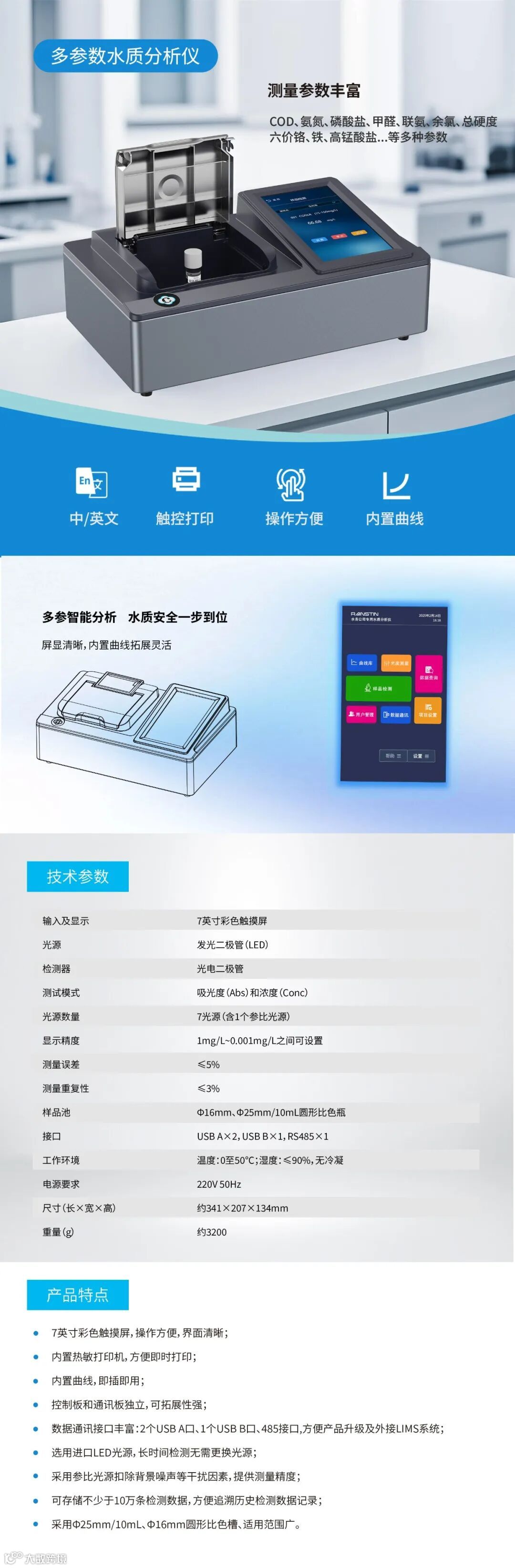 适用于环保污染源监测、工业过程用水监测、市政污水处理、地表水监测等领域,以及生物制药、污水处理、采矿等多种行业。