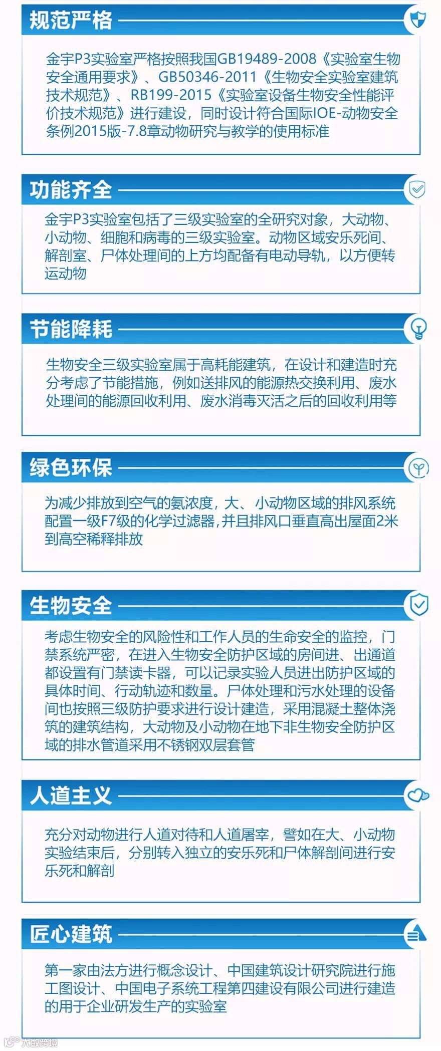 金宇P3实验室是一家由法方进行概念设计、中国建筑科学研究院进行施工图设计、中国电子系统工程第四建设有限公司进行建造的用于企业研发生产的实验室。根据国家高级别生物安全实验室的功能定位和目标要求,实验室总建筑面积12451平方米,占地面积3795平方米,建筑高度14.8米,包括大动物实验室、小动物实验室、细菌及病毒实验室等多个核心区域。地面采用耐高温、耐水、耐腐蚀的材料铺设而成,动物房用活动的围栏进行隔离,地面还配有下水管道,污水可由管道排入地下污物处理设备中。