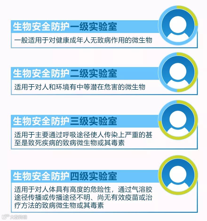 生物安全防护实验室,是指实验室的结构和设施、安全操作规程、安全设备等,能够确保工作人员在处理含有致病微生物及其毒素时,不受实验对象侵染,周围环境不受污染。根据所操作的生物因子的危害程度和采取的防护措施,将生物安全的防护水平 (Biosafety Level,BSL)分为四级,一级防护水平最低,四级防护水平最高。