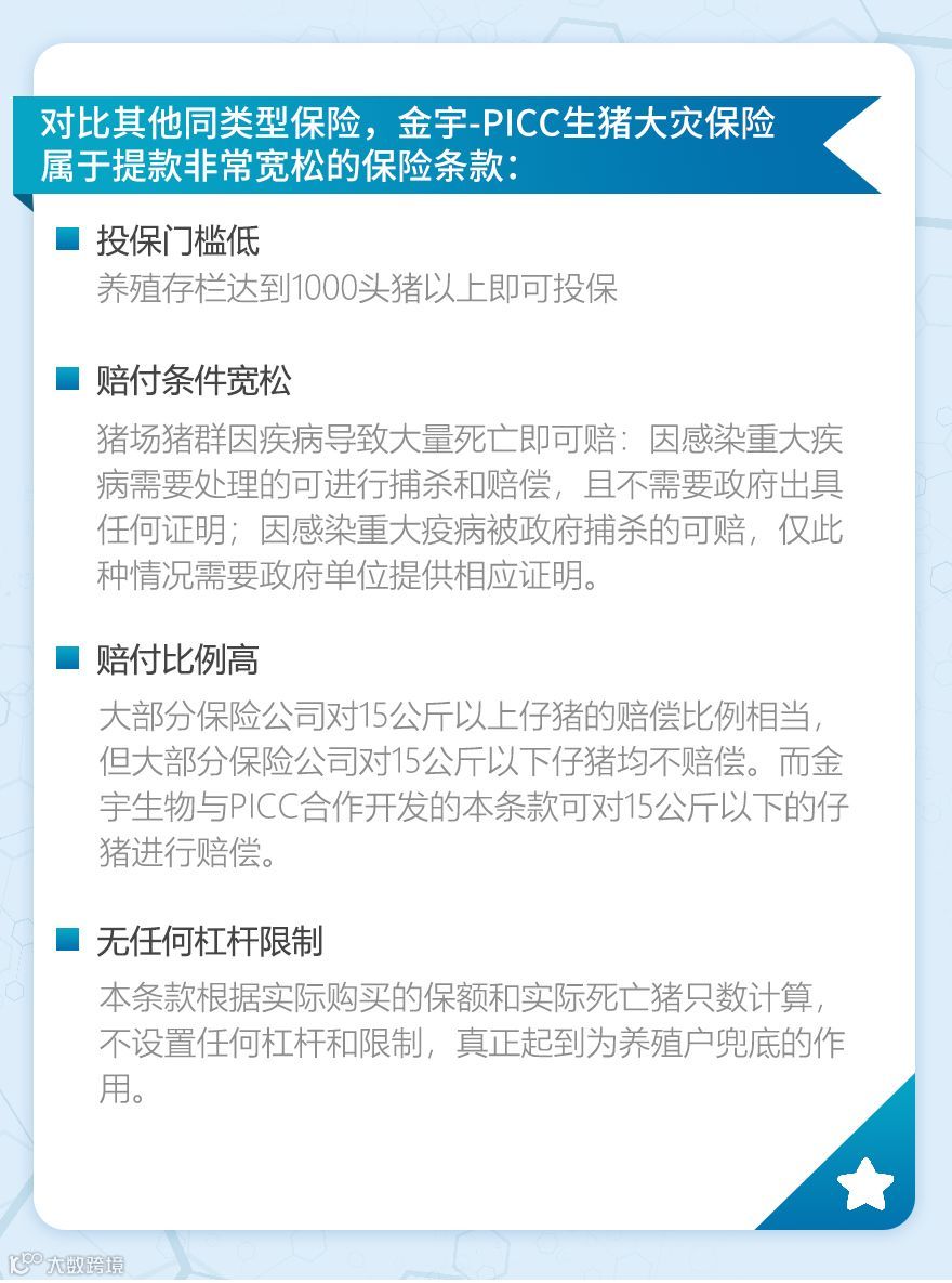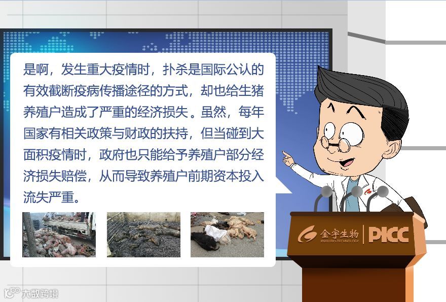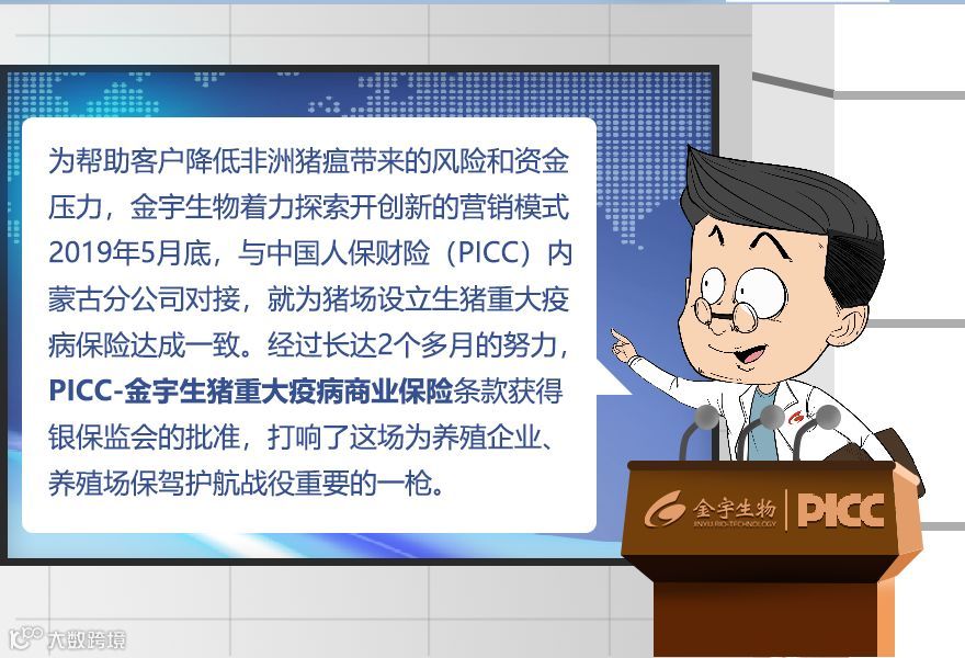 生猪保险业务是金宇为猪场提供的一种雪中送炭的服务,也是金宇主动承担社会责任的一种体现。金宇生物联手PICC,携生猪重大疾病保险,为您的养殖之路保驾护航!