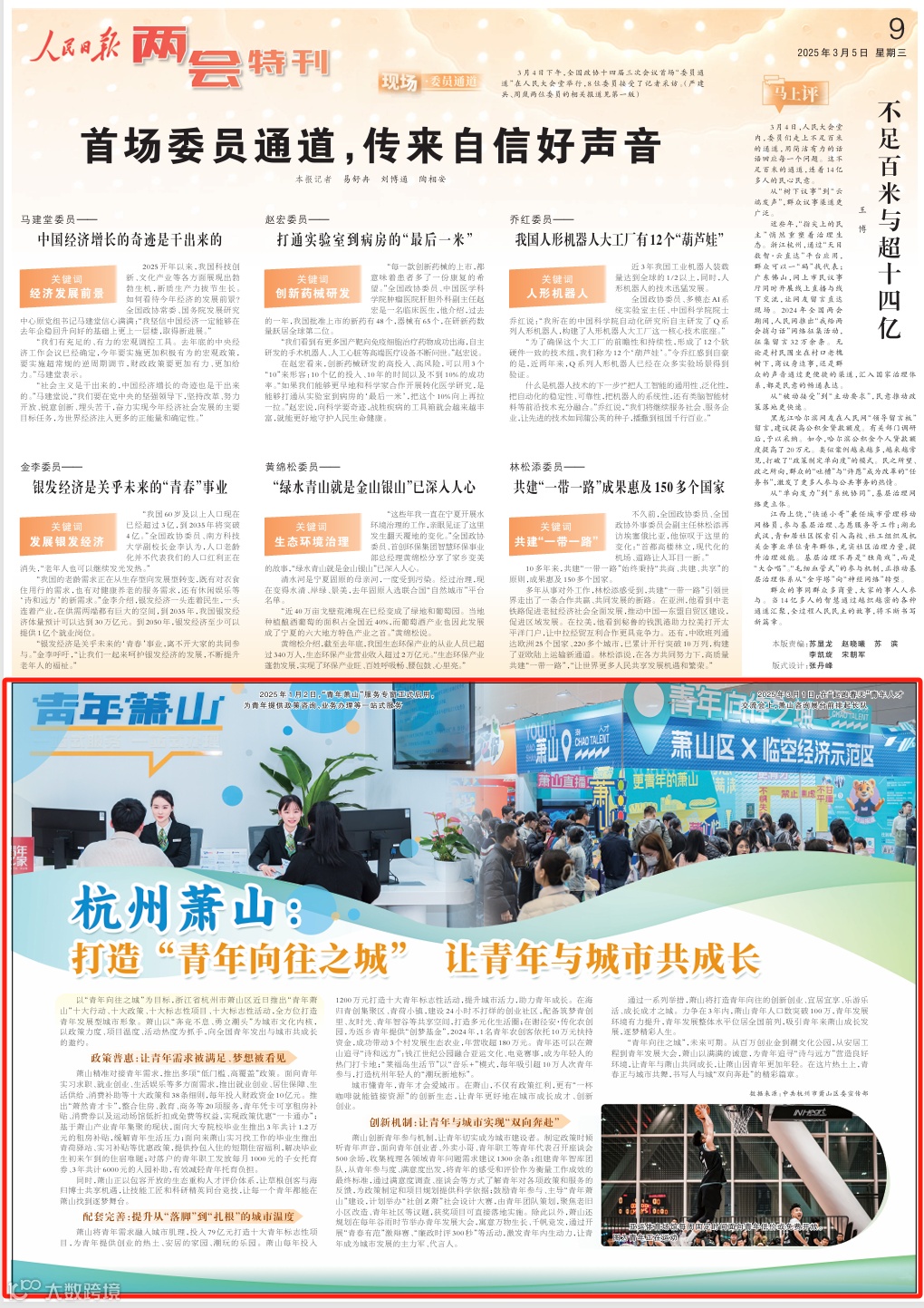 昨天,《人民日报》“两会特刊”刊登了《杭州萧山:打造“青年向往之城” 让青年与城市共成长》的文章。