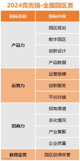 全国园区类年度测评基于4大核心指标、12大关键指标,以及近40项细分指标,根据申报园区填写的资料进行相关指标的筛选以及权重设定,并进行定性和定量的打分,最终得出以下结果。