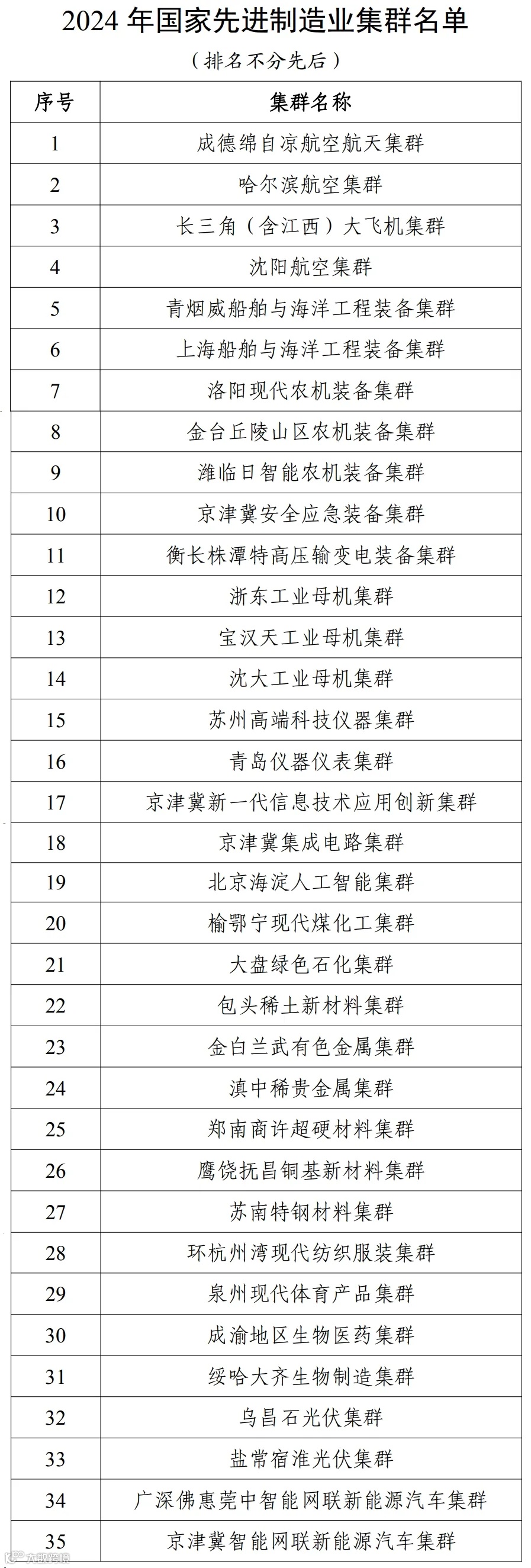 为贯彻落实党中央、国务院决策部署,培育壮大先进制造业集群,工业和信息化部组织开展2024年先进制造业集群竞赛。经小组赛、综合赛评审并向社会公示,现公布成德绵自凉航空航天集群等35个集群为国家先进制造业集群(以下简称国家级集群),有关事项通知如下。