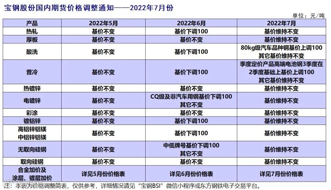 宝钢股份2022年7月价格发布