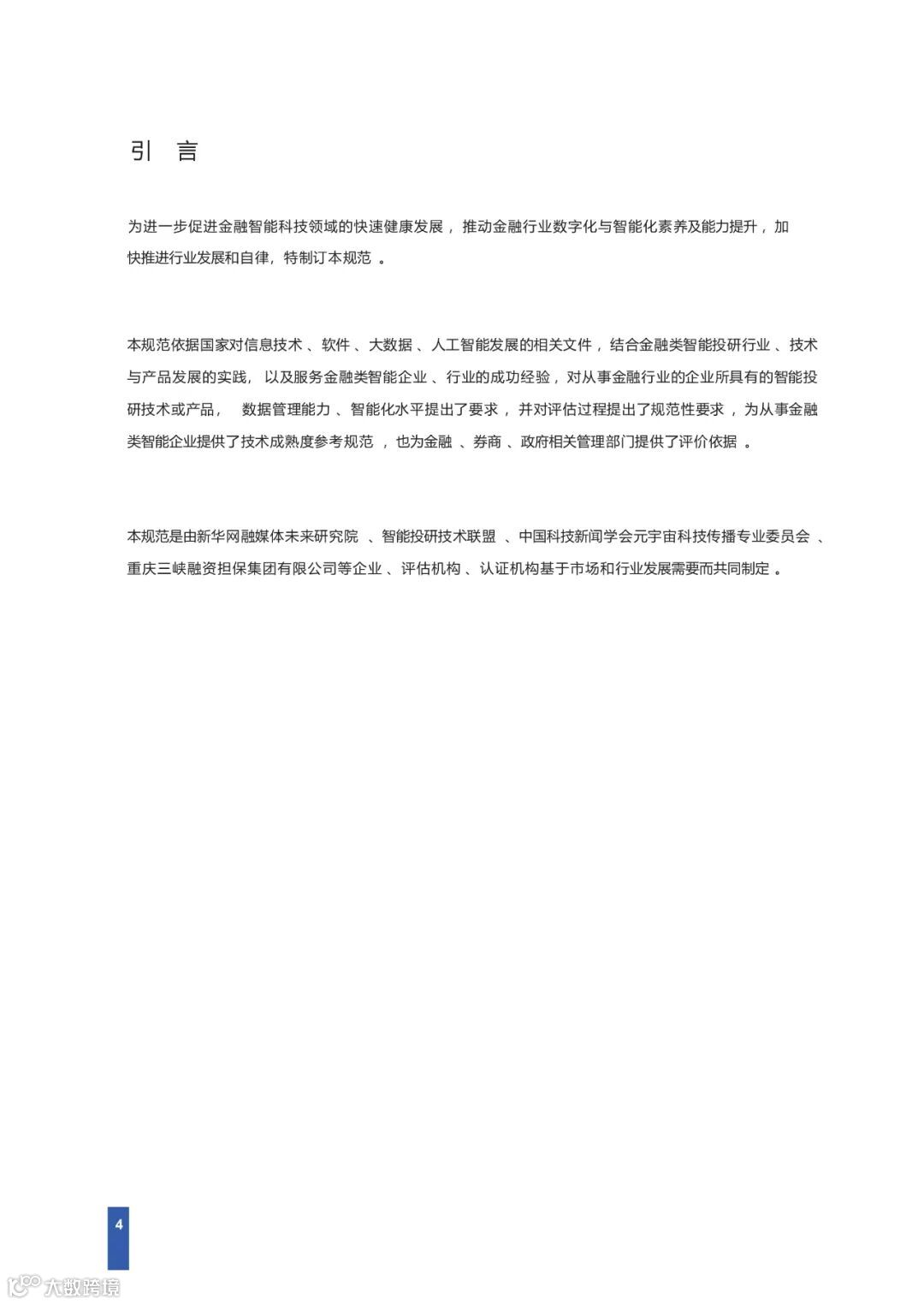 为进一步促进数字金融与智能科技领域的健康发展 ,推动金融行业数字化与智能化素养及能力提升 ,加快推进行业发展和自律,中国科技新闻学会元宇宙科技传播专业委员会与智能投研技术联盟 、新华社国家重点实验室生物感知智能应用研究部、新华网融媒体未来研究院 、重庆三峡融资担保集团股份有限公司等企业共同制定发布 《金融智能科技评估标准报告》。