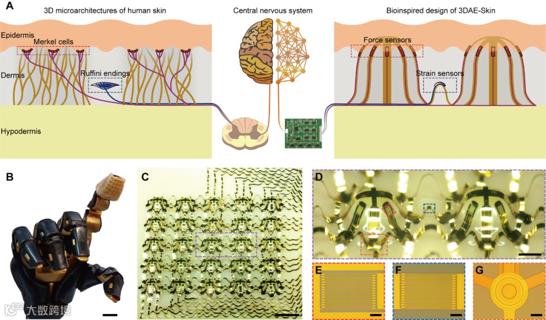 具有三维架构的电子皮肤:仿生设计概念及真实器件图片。A图展示电子皮肤的仿生设计概念;B图为贴于机械手指尖的电子皮肤;图C-G为电子皮肤的照片、力传感单元与应变传感器局部放大图及应变栅线与过孔局部显微放大图片