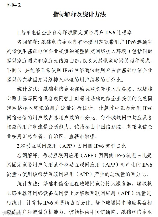 五、加强督促评测,促进工作实效落地。基础电信企业集团公司要对开展“网络去NAT”试点工作的子(分)公司给予必要政策倾斜和资金保障。要不断丰富监测技术手段,构建监测体系,按月开展分省基础电信企业自有环境固定宽带用户IPv6连通率、移动互联网应用(APP)固网侧IPv6流量占比、内容分发网络(CDN)IPv6流量占比(附件2)等指标统计。工业和信息化部、中央网信办将适时组织公布相关监测结果。各省(区、市)通信管理局、工业和信息化主管部门要强化行业管理,加强工作指导。各省级网信办要督促互联网企业加强协同,合力推动“网络去NAT”目标完成。