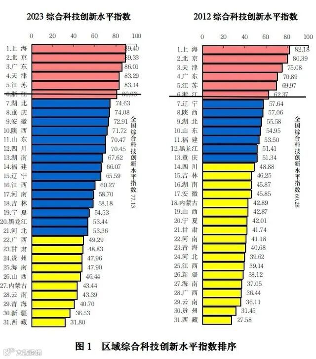 党的十八大以来,各地区深入贯彻落实创新驱动发展战略,创新能力显著提升。从2012年和2023年两本《评价报告》的对比分析发现(见图1),2023年,我国31个省区市综合科技创新水平指数得分相比2012年均有不同程度提升。2023年,全国综合科技创新水平指数得分为77.13分,比2012年提高了16.85分。