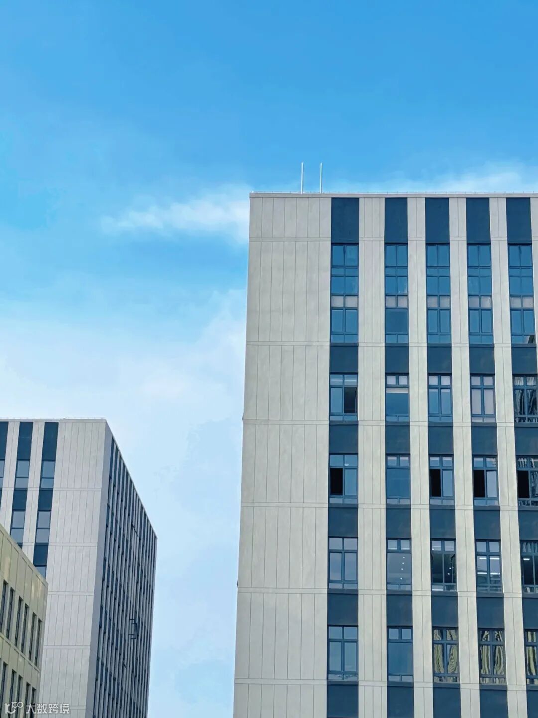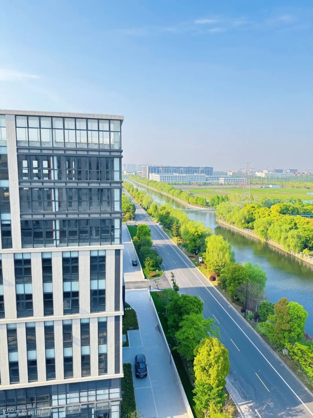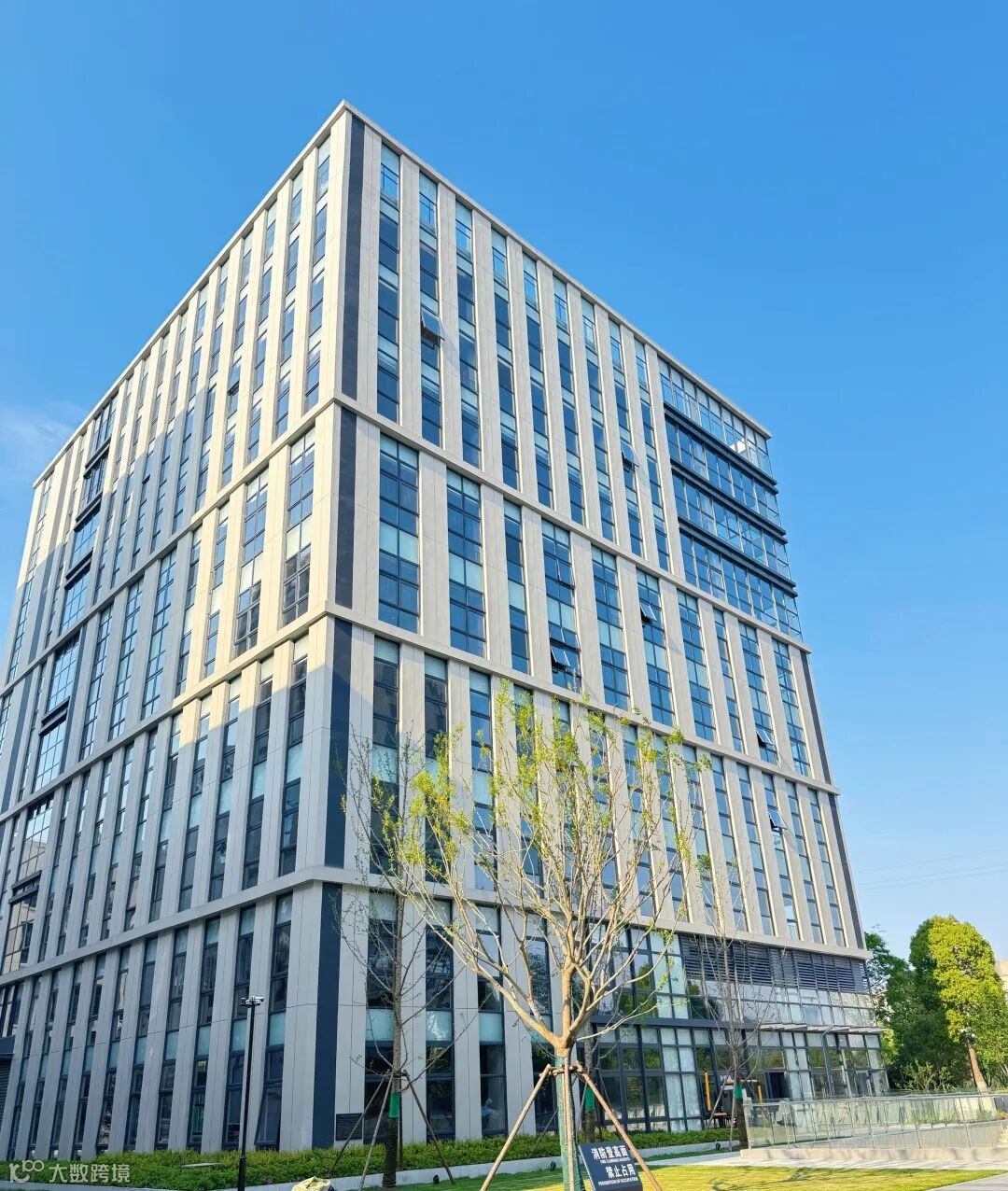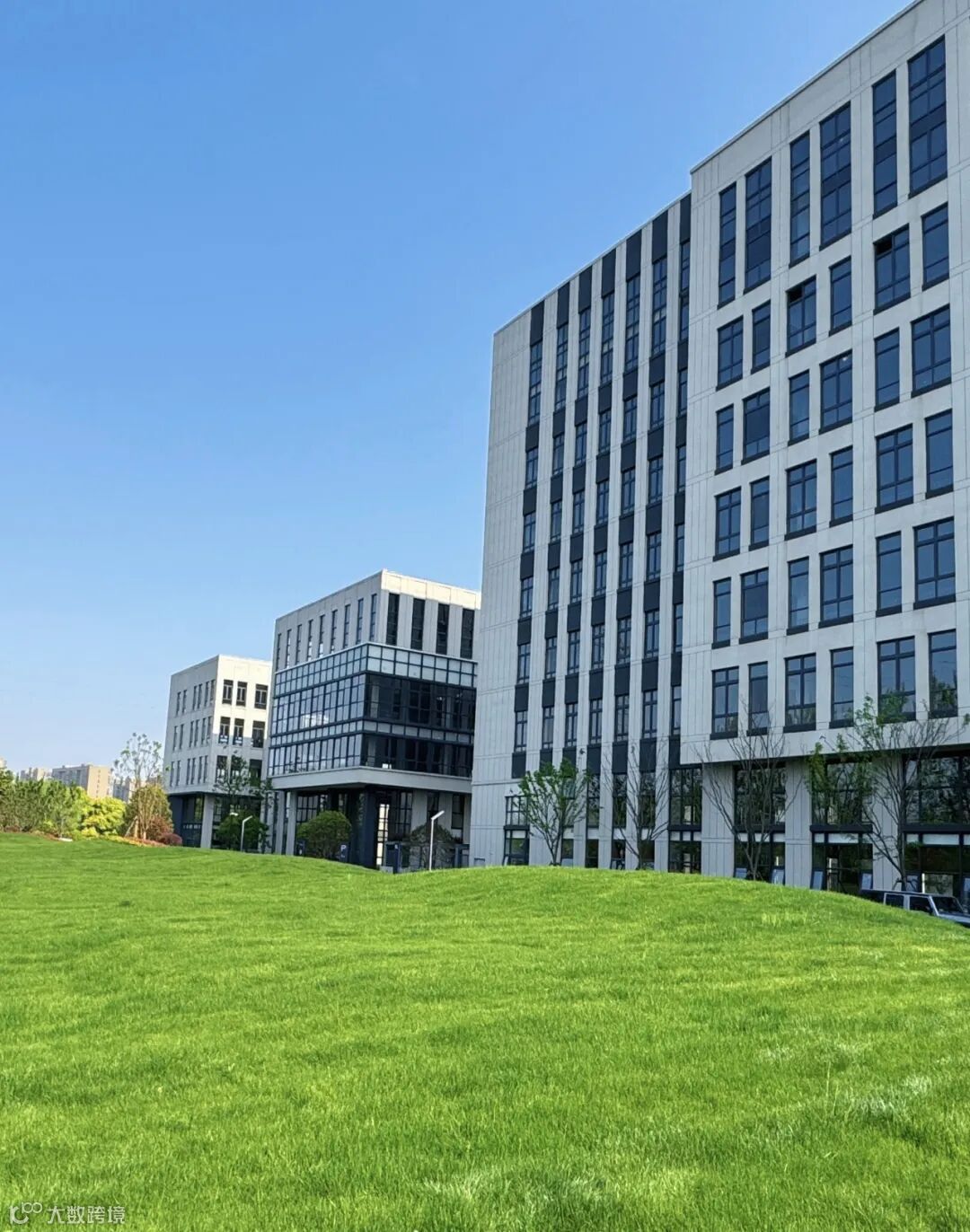 玻璃反射着阳光,绿色植被映衬下,呈现出一幅生机盎然的景象。