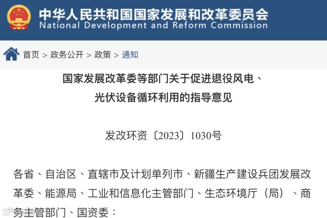 近日,为了进一步促进退役风电、光伏设备循环利用,加快培育资源循环利用产业,国家发展改革委联合多部门发布了《关于促进退役风电、光伏设备循环利用的指导意见》(发改环资〔2023〕1030号,以下简称《指导意见》),提出了六大重点任务,包括大力推进绿色设计、建立健全退役设备处理责任机制、完善设备回收体系、强化资源再生利用能力、稳妥推进设备再制造、规范固体废弃物无害化处置。
