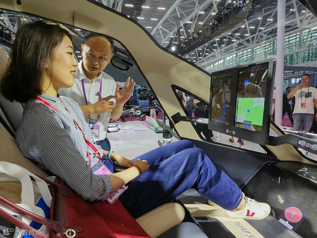 记者在广交会上体验亿航智能载人级自动驾驶飞行器。
