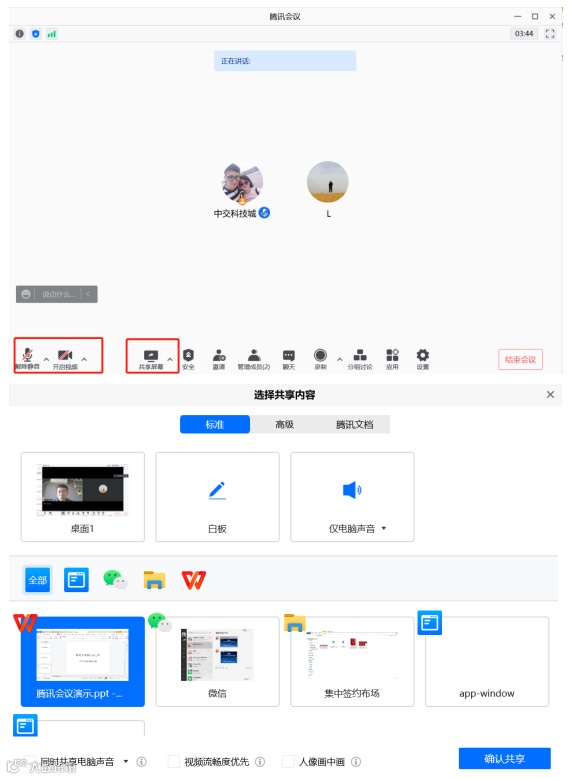5、进入会议室,按照路演排序,开启视频、解除静音、共享屏幕(提前打开ppt,ppt 比例16:9;共享屏幕时选择已打开的ppt)