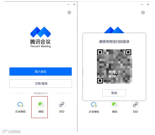 2、打开安装好的腾讯会议,点击下方微信,手机微信扫描二维码登录