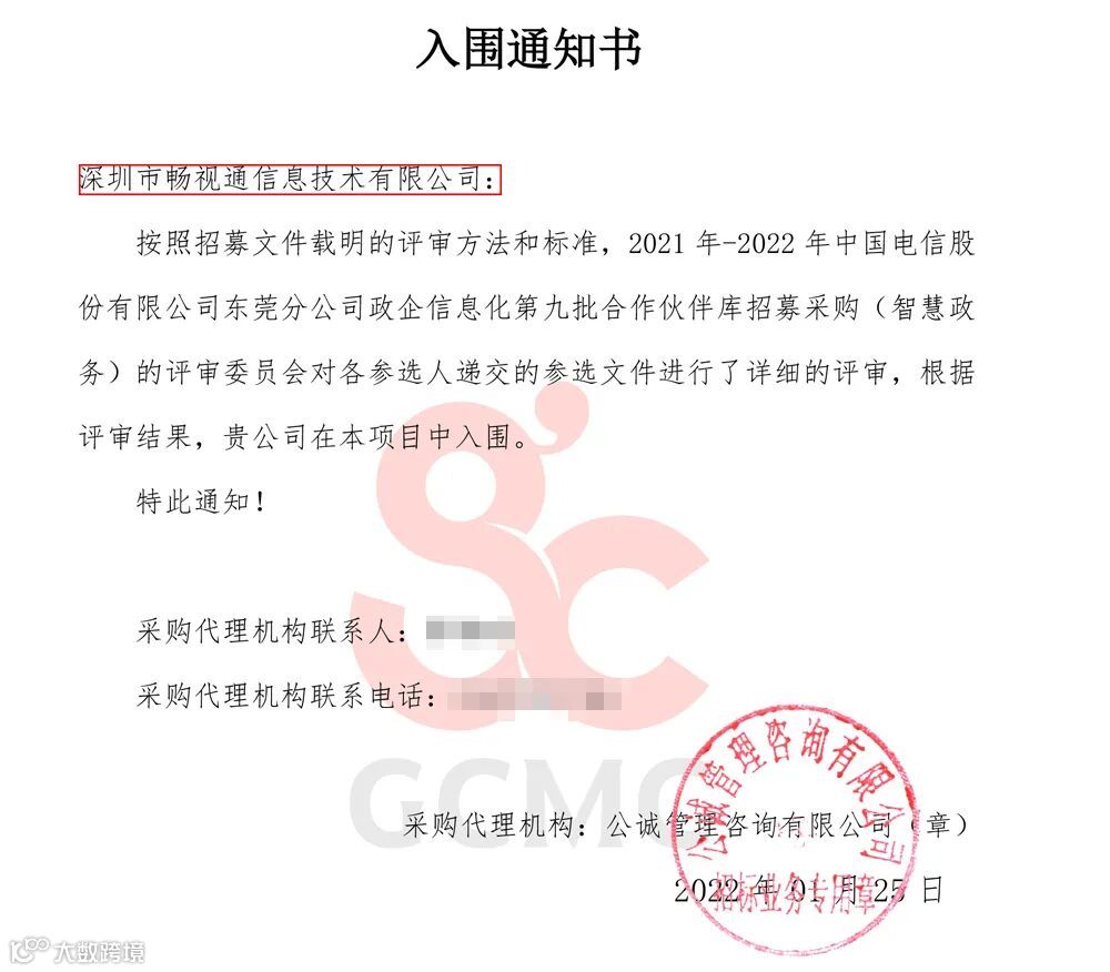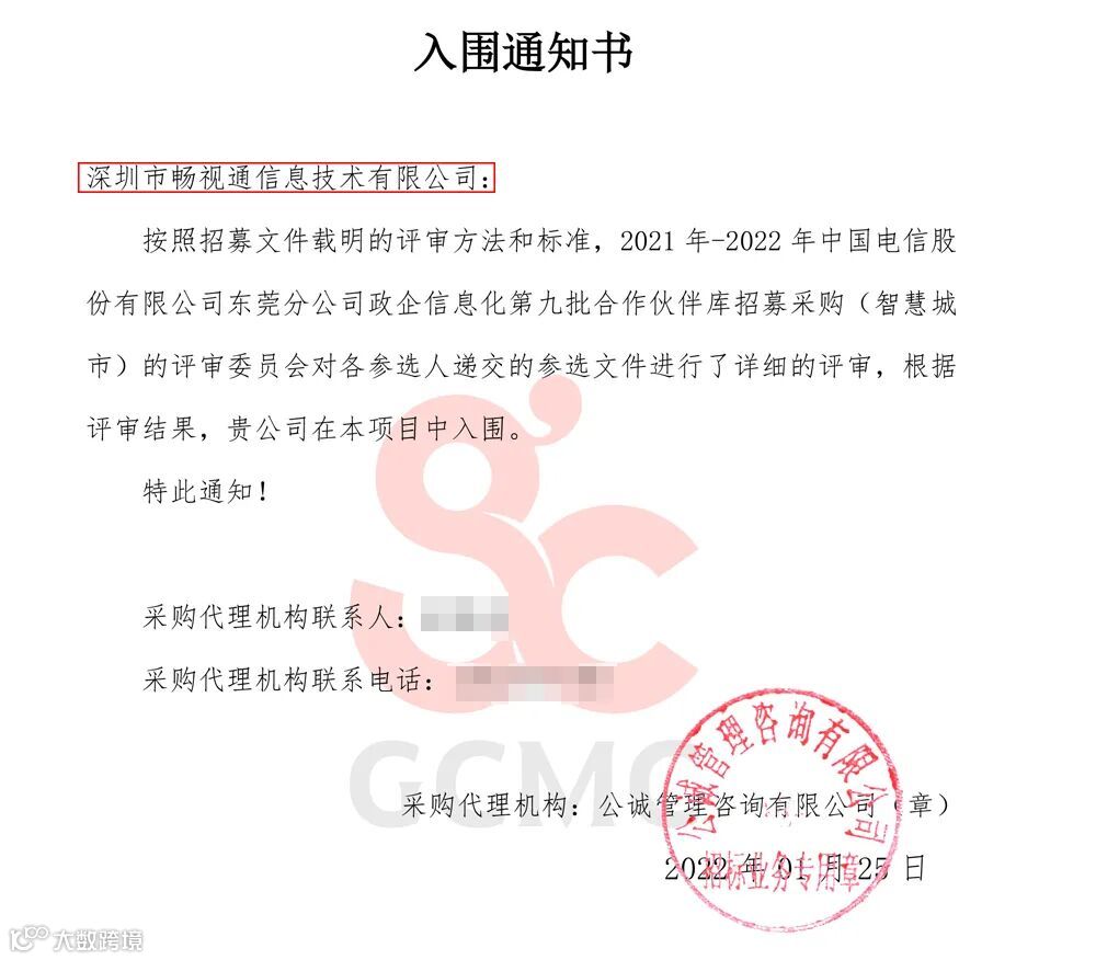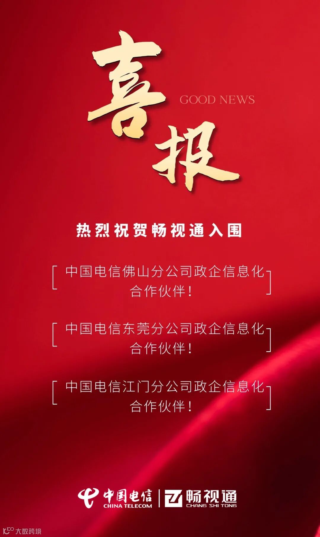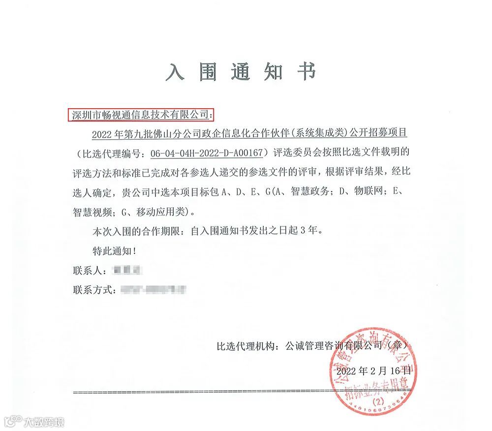 近日,《2022年第九批中国电信佛山分公司政企信息化合作伙伴招募公告》、《2021年-2022年中国电信东莞分公司政企信息化第九批合作伙伴库招募公告》、《中国电信江门分公司政企信息化合作伙伴招募(第十期)》入围公告正式发布,畅视通均成功入围,成为佛山电信、东莞电信、江门电信DICT合作伙伴!