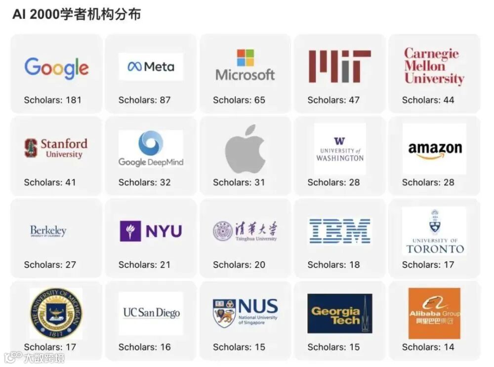 具体来看,从AI 2000最具影响力学者入选数量来看,谷歌、Meta(原Facebook)及微软三大科技公司占据优势地位,公司拥有的顶级AI学者数量,无论是top 10还是top 100数量,均远多于高校。其中位居首位的谷歌公司,共181人次入选榜单,也是唯一一家学者数过百的机构。