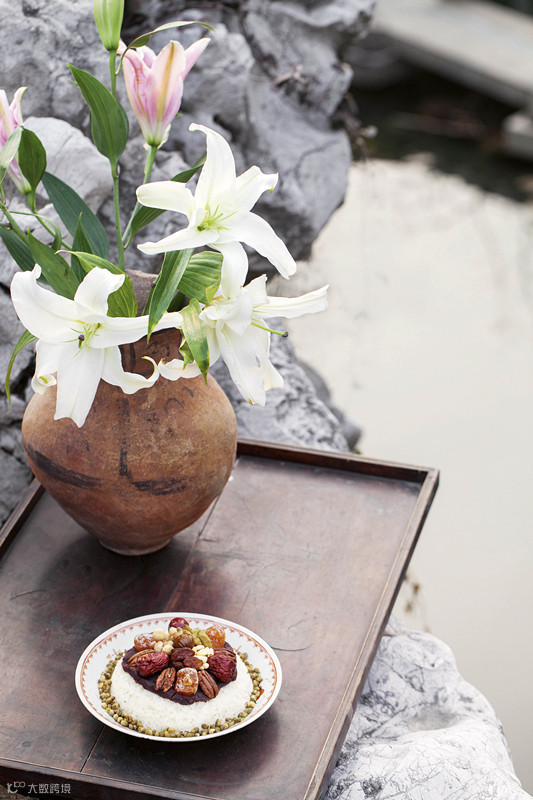 相传源于武王伐纣的庆功宴会。庖人应景而做八宝饭庆贺。八宝象征有功的八士,按照这种传说,此点心应该已历经千年。