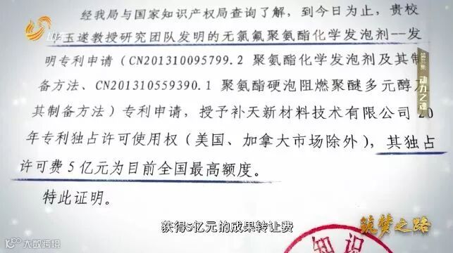 2017年3月,山东理工大学毕玉遂教授研究团队的无氟氯聚氨酯发泡剂专利,以5亿人民币的价格授权给了一家国内企业。