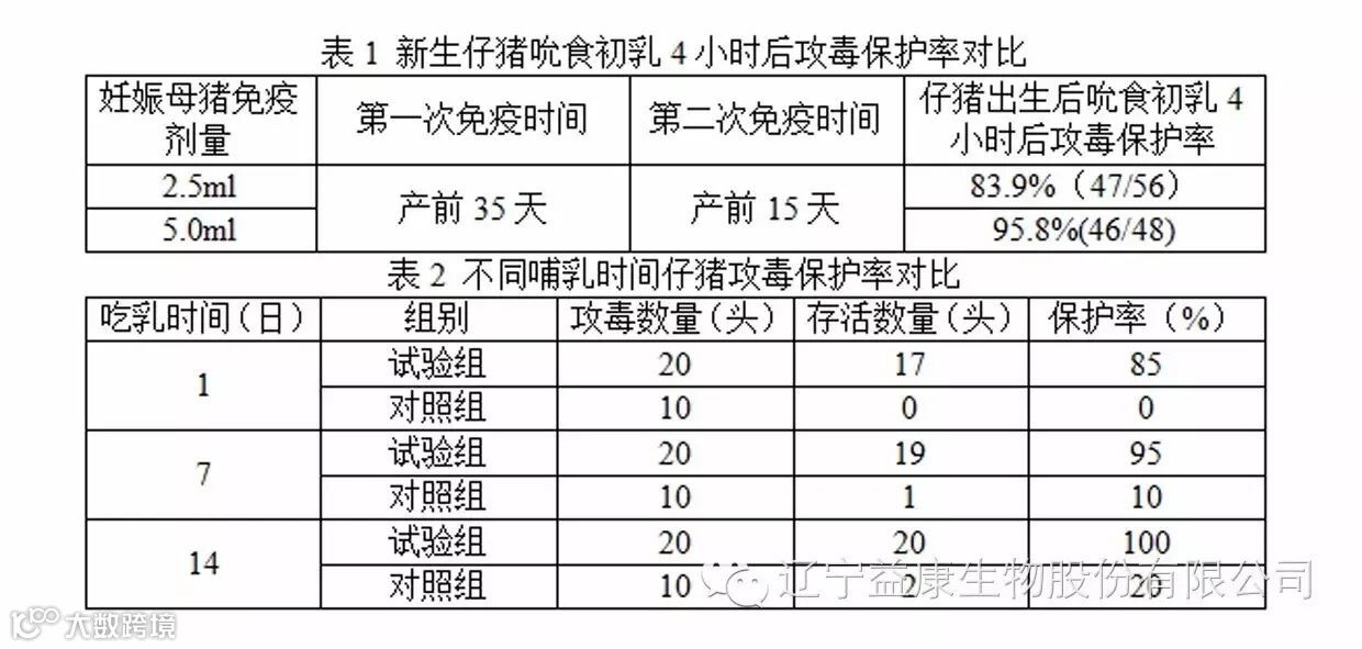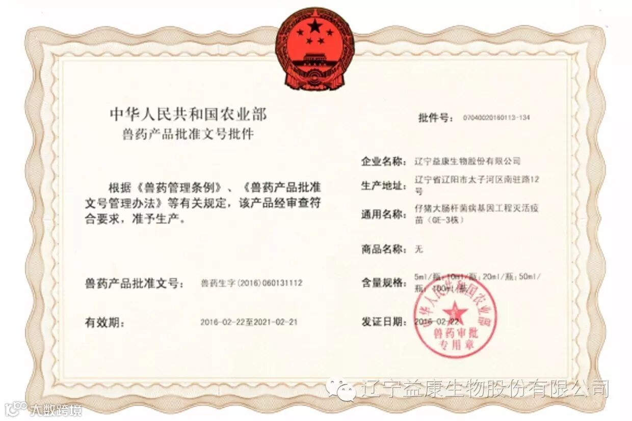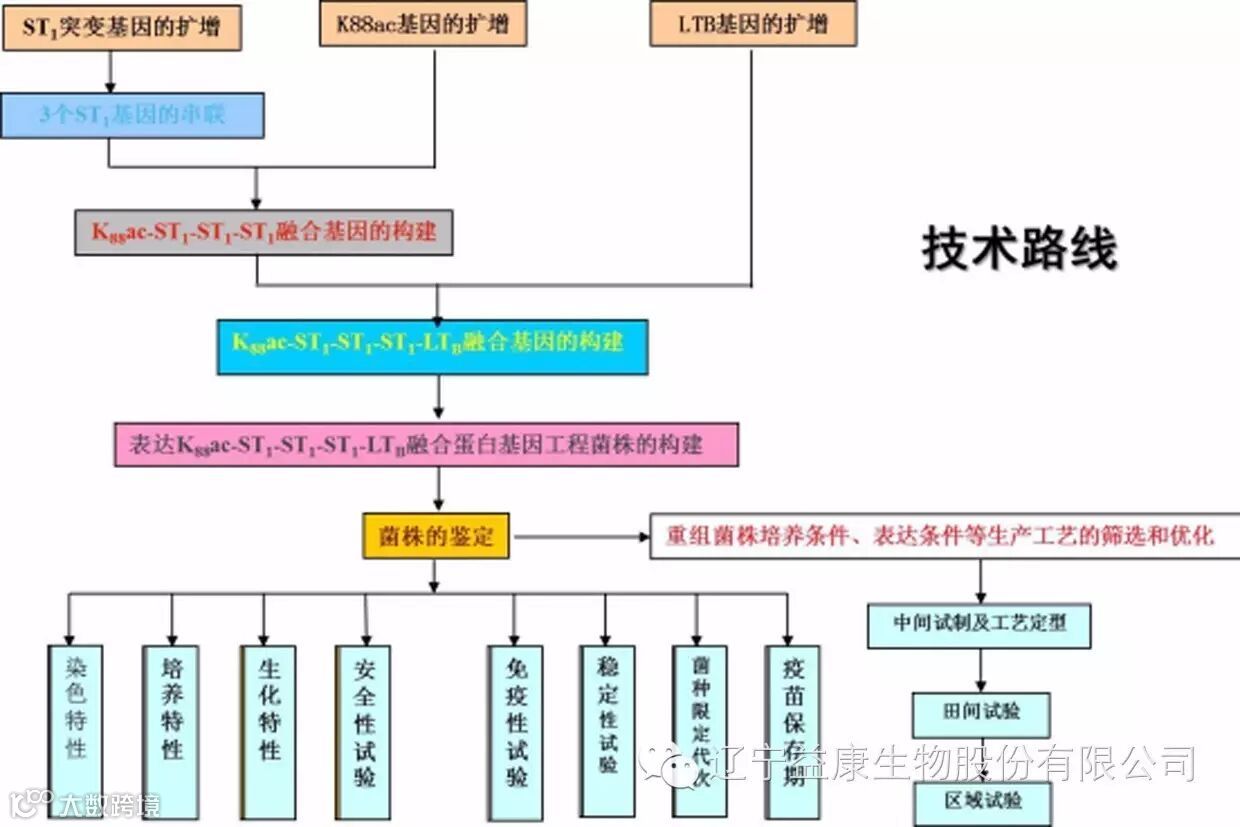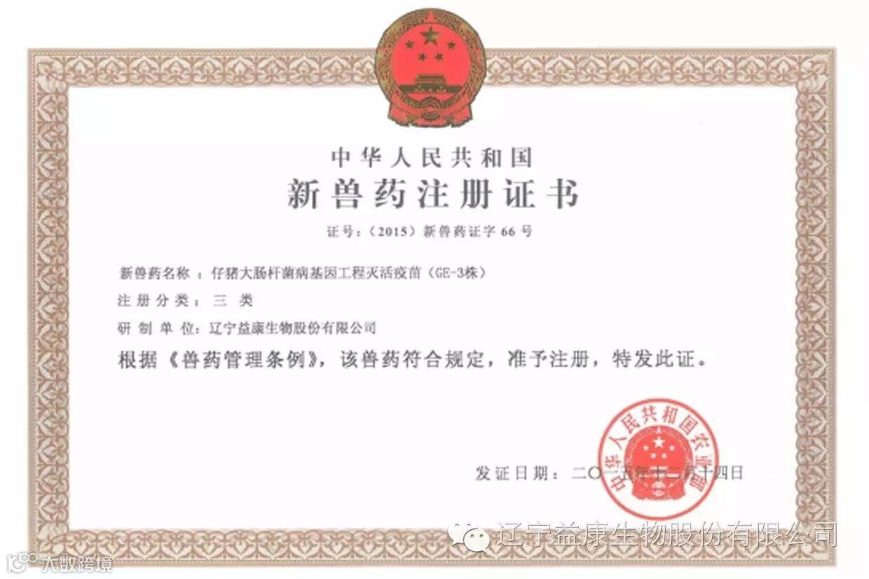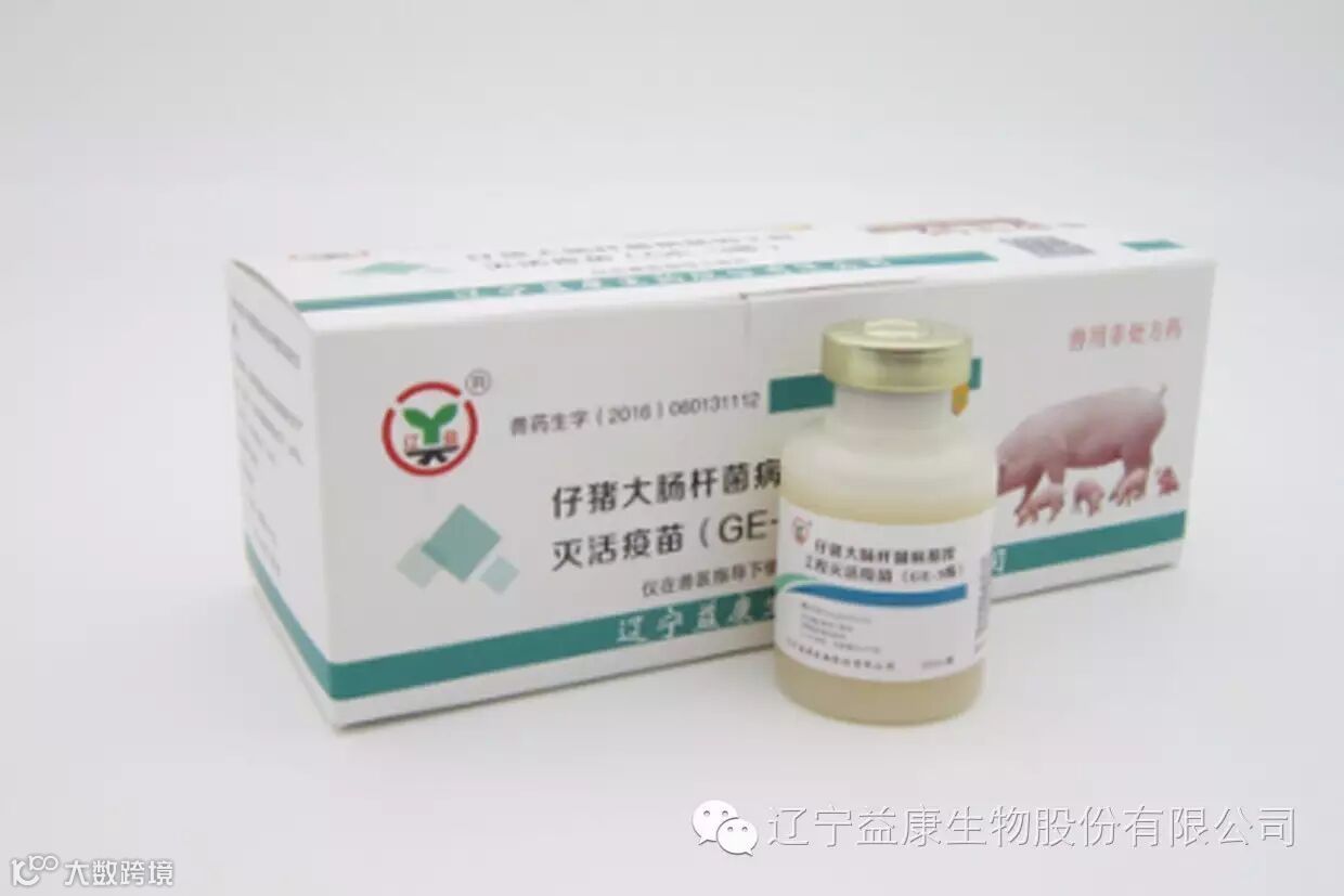 辽宁益康生物股份有限公司科研人员经过大量的流行病学调查,病原菌的分离和鉴定,致病因子的研究,从仔猪大肠杆菌病的致病机理出发,成功地研制出了免疫谱广、免疫原性好、使用安全的仔猪大肠杆菌基因工程疫苗,从根本上解决了由于大肠杆菌由于血清型众多无法采用疫苗免疫的这一世界难题。仔猪大肠杆菌基因工程疫苗的免疫机理为妊娠母猪通过产前免疫接种,产生三种抗体(ST抗体、LT抗体、K88抗体),仔猪出生后通过吮禽母乳,获得这三种抗体而产生被动免疫,抵抗大肠杆菌在肠道定植,有效中和肠毒毒,使仔猪获得保护。