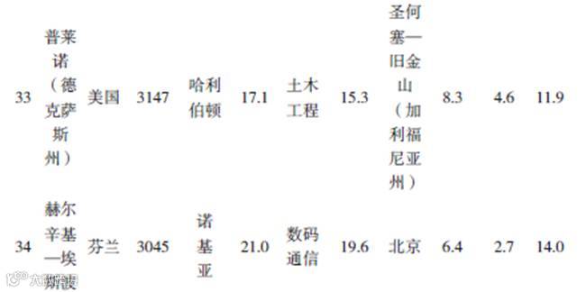 名列第二的深圳- 香港集群的专利主要集中于数码通信,约有41% 的专利申请都属于这一门类。相比之下,名列首位的东京- 横滨集群的多元特点则明显得多,其主要技术领域—电力机械、仪器和能源—只占其全部PCT 申请的6.3%。在前100 强集群中,最为突出的技术领域是医疗技术(在17 个集群中占据领先地位),其次是数码通信(在16 个集群中占据领先地位)、制药(在15 个集群中占据领先地位)和计算机技术(在12 个集群中占据领先地位)。总体来说,在所有专利申请覆盖的35 个技术领域中,有18 个不同技术领域成为了至少一个集群的头号领先领域。