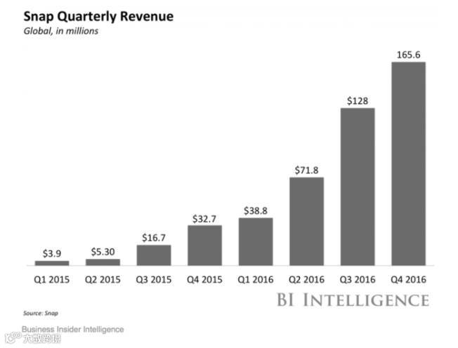 Snap 2016年第四季度财报显示,该季度Snap营收1.66亿美元,与上季度的1.28亿美元相比增幅喜人,而与2015年第四季度的3270万美元营收相比更是有着量级变化。