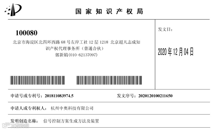 近日,杭州中奥科技有限公司获得国家知识产权局颁发的《多路口信号控制方案生成方法及装置》、《信号控制方案生成方法及装置》和《城市区域分级划分方法及装置》三项发明专利授权证书,这些专利技术为智慧城市、智慧交通提供不断创新的技术应用支撑。