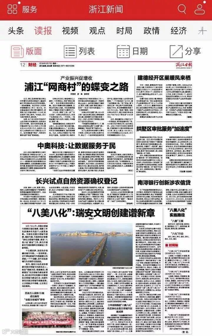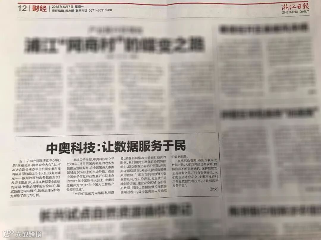 5月7日,浙江日报-财经版刊登了“中奥科技,数据服务于民”的报道,在2018“西湖论剑”会议中总裁沈贝伦做出《让政务充满AI——数据治理与政务数据安全》精彩主题演讲后,广受社会追捧,各路媒体争相采访,报道。以下是浙江日报-财经刊登内容: