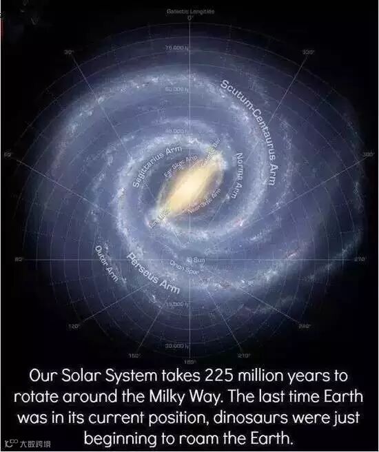 我们的太阳系会花上2.25亿年绕行银河系,上一次地球在同一个位置的时候,恐龙都还存在着。