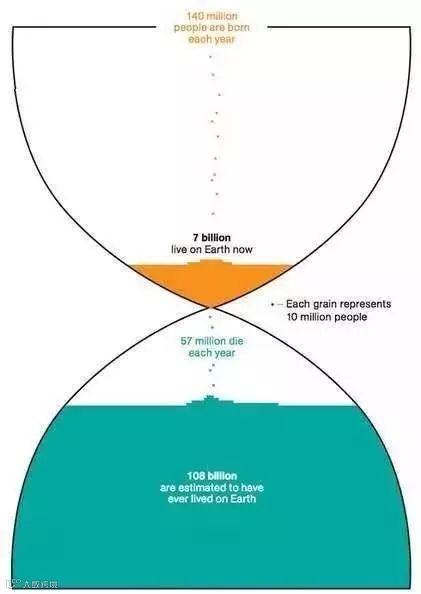 上图每一个点就是1000万人,每年有1.4亿人诞生,现在有70亿人口,每年有5700万个人死亡,估计曾有1080亿人在地球活过并死去。