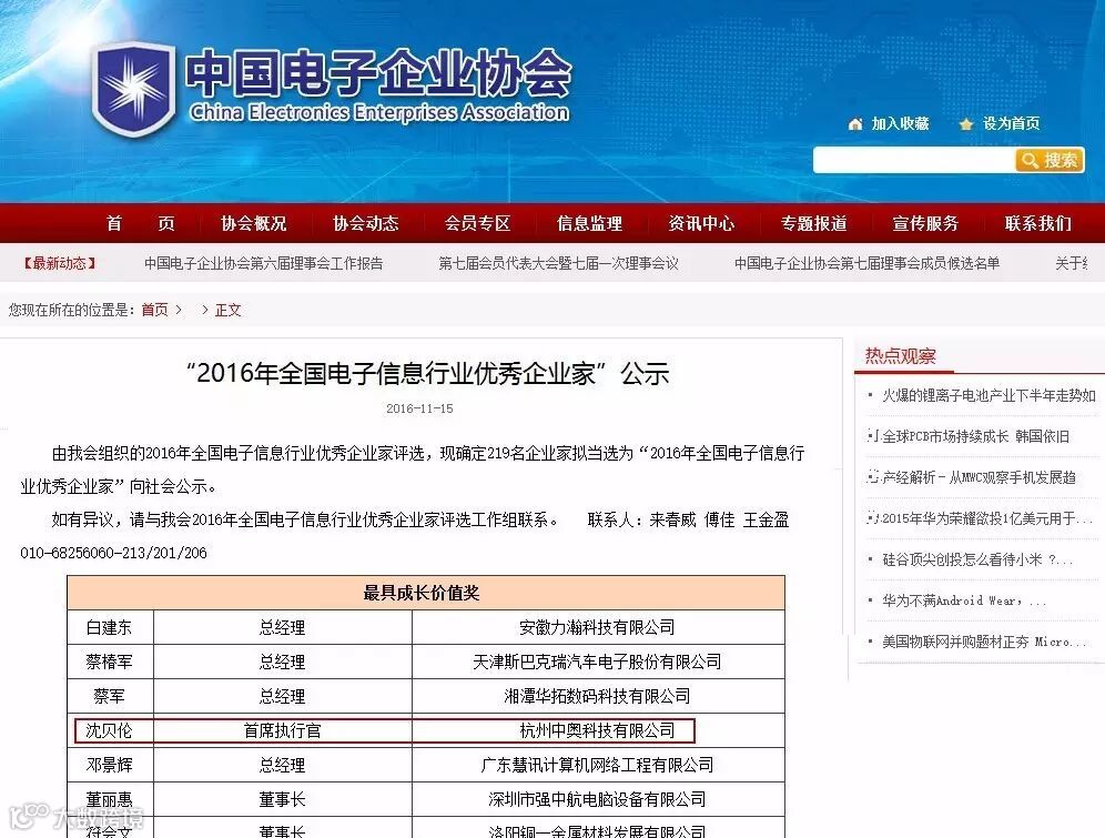 2016年11月15日,全国电子信息行业协会组织专家对全国电子信息企业进行评选,确定219名企业家当选为“2016年全国电子信息行业优秀企业家”,并向社会公示。中奥科技创始人沈贝伦,获得“最具成长价值奖”。