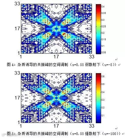 为了进一步清楚的分析杂质散射的效应,我们对杂质诱导的共振态的空间调制进行了计算,如图4是x=0.55时在强散射下u=-5时的杂质诱导的共振态的空间调制,图5是x=0.55时在强散射下u=-100时的杂质诱导的共振态的空间调制,杂质位于中心点(17,17)处,从图像中我们发现空间调制是四重对称的,而且对称的方向与