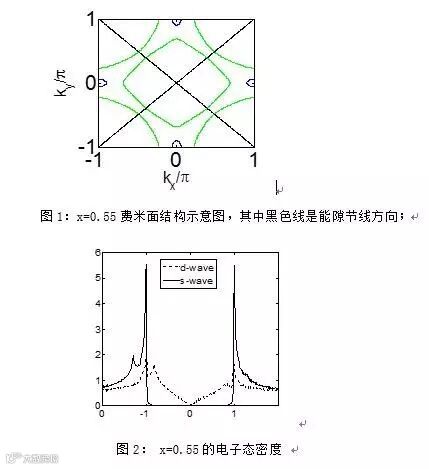 ,再结合公式(2)中给出的能带色散关系,拟合出BiS2-基超导体的费米面拓扑结构,如图1所示,其中绿色线和蓝色线是杂化能带所围成的费米面,黑色线代表的是能隙节线结构,从图中我们可以看出当掺杂浓度x=0.55时,电子口袋和空穴口袋同时存在;同时我们也计算得到了与隧道电子谱测量定性一致的正常态和超导态下的电子态密度(DOS),如图2是x=0.55的电子态密度,我们发现正常态的DOS是呈U型结构,且在正负能量处出现了两个显著的散射峰,这正是强关联电子效应的体现;从图中我们看到