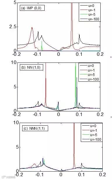 图3:x=0.55不同散射势下单个非磁性杂质诱导的LDOS,(a)是杂志点(IMP)、(b)是最近邻点(NN)、(c)是次近邻点(NNN)。